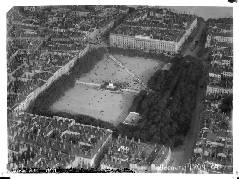 Vue aérienne de la place Bellecour à Lyon. Le Rhône est visible en haut à droite de l'image (vue vers le nord-est)